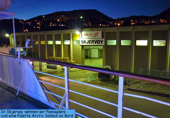 Wir legen in Nesna an, einem winzigen Fischerdorf, wo wir eine norwegische Folkband an Bord nehmen, (5 Musiker, 4 Instrumente), ein rotes Motorboot, (Yamaha 115 PS), 30 Kisten Fisch (Arctic Salmon frozen) und nur eine Palette Spanplatten dafür abliefern. Ein guter Tausch, wie ich finde.